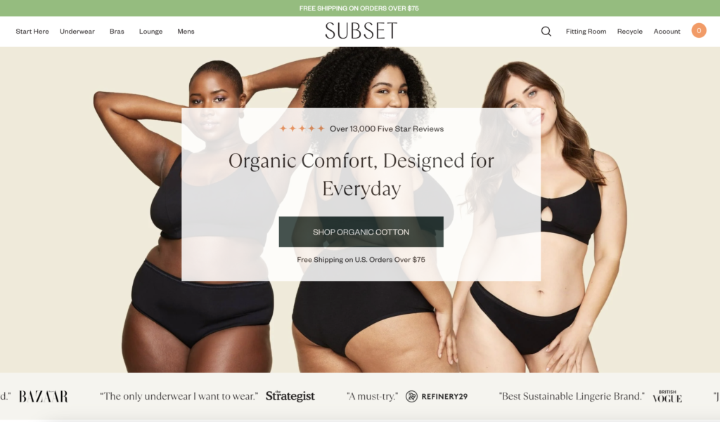Subset (formerly Knickey) rebranded with a focus on elevated organic basics. Their whole thing? Clean, simple essentials made with organic cotton and sustainable practices.