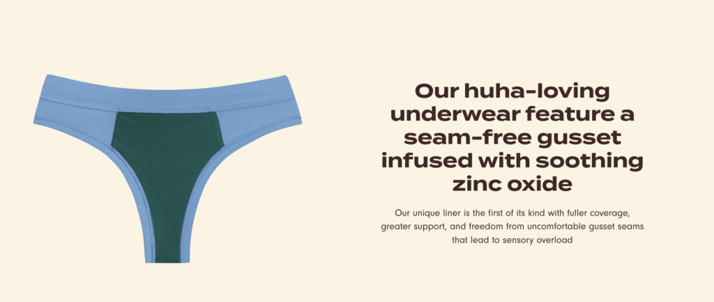 Instead of organic cotton, Huha uses plant-based TENCEL™ paired with a zinc oxide–infused gusset designed specifically for moisture management and soothing support.
