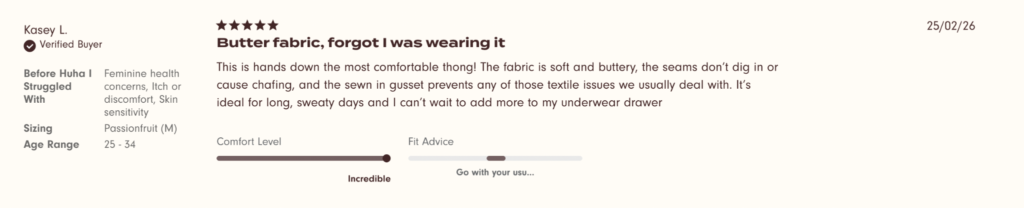 I didn’t chafe. I didn’t get ingrown hairs. I didn’t get pulled out of the moment because I needed to readjust my underwear. The fabric and seams are great for sensitive skin. The zinc-oxide infused gusset is a cherry on top and a major win for womens vulvar health.